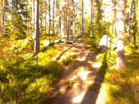 I huvudsak naturstig. Följer längs med hela naturreservatets utkant. Passerar flera utsikter, bland annat "Högsta punkten" och Lärkstugan. Stigen gör även en avstickare till Kolarkojan.