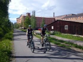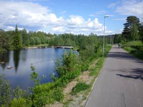 På den gamla järnvägsbanken mellan Rättvik och Falun går det alldeles utmärkt att cykla. Det är mycket lätt åt ena hållet, söderut, eftersom banken sluttar mot söder. Åt andra hållet får man lite mer motlut, men fortfarande är det lätt att ta sig fram. Nästan grusväg hela sträckan, bara några bit i Grycksbo, genom Sågmyra och kortare bitar längre norr ut.
