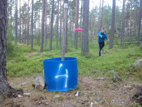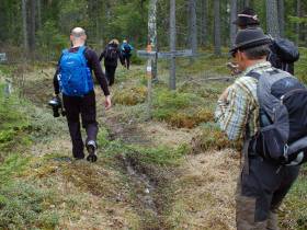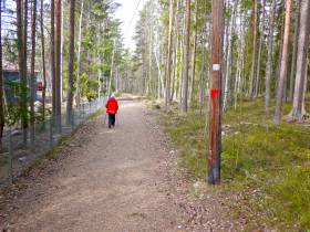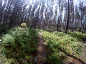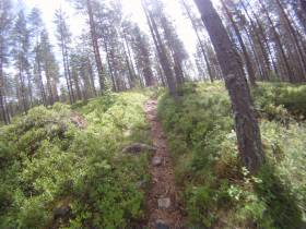 Några hundra meter efter du kommit ut på vägen går stigen upp till höger uppför en backe. Efter ett tag kommer du ut på en ny väg som du följer ett par hundra meter för att sedan vika in höger på turens roligaste parti som går svagt utför på härlig stig hela vägen ner tills du kommer ut på en grusväg.