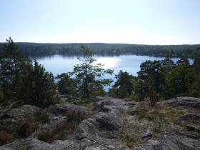 När leden viker av från den gröna leden börjar det roliga. Här bjuds vandraren på en fantastik utsikt över Källtorpssjön och fina hällar som går längs med kanten på brandområdet.