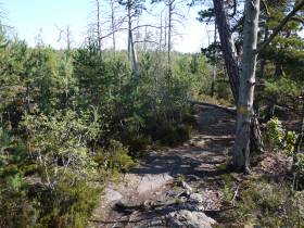 På södra delen av sjön fortsätter leden på en bred men bitvis kuperad grusväg.