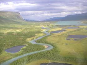 Någon kilometer öster om Kebnekaise fjällstation går du över Tarfalajåkka, som avvattnar glaciärerna i Tarfaladalen. Därefter hamnar du nedanför skogsgränsen, med gles fjällbjörkskog omkring dig.