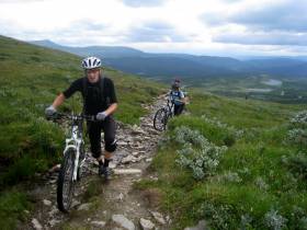 Hemvägen är en ren fröjd och ni kan stå på hela vägen ner till trädgränsen och ravinen där det blir lite stenigare men oftast helt cykelbart. På slutet är det bara att cykla mellan stugorna på grusvägen tillbaka till parkeringen.