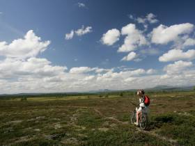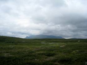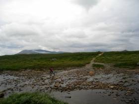 Från toppen av backen hela vägen till att leden möter sommarleden är det ganska platt stig bland myrmark. Hela vägen är cykelbar med undantag av något för fjällen obligatoriskt blöthål.