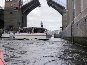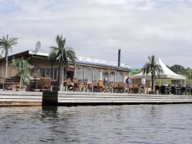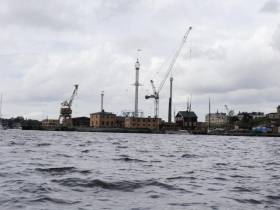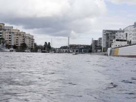 Väl ute ur Hammarbyslussen möts du av Industriområde på höger sida och ett fint promenadstråk på vänster. Här ligger även Thaibåten om du är sugen på lite mat. Vattnet är lite strömt här och vågorna studsar mellan kajkanterna.