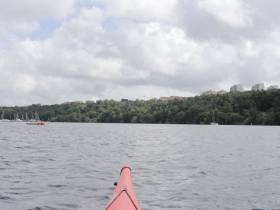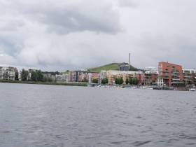 Nu närmar vi oss Hammarbysjöstad som visar sig vacker med sina grönområden och Hammarbybacken som reser sig på höger sida. Lite längre fram passerar vi även Kvarnvikens klätterklippa innan vi kommer ut i Stockholms inlopp.