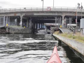 Att slussa med kajak är gratis också vilket är extra lyxigt. Paddla in i slussen när lampan lyser grönt och håll i en utav snörena som hänger ned. Inget annat behöver tänkas på vid slussning med kajak.