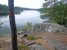 Efter ytterligare ca 1,5 kilometer nås sjön Hällaren, en bra badsjö. Lämplig badplats finns vid sjöns sydände. Längre fram, utmed sjöns västra strand, finns ett skärmskydd. Vandringen fortsätter genom storskog, hällar och myrmarker, förbi Stora Gyringen, en näringsfattig skogssjö. I dessa trakter dödades de sista sörmländska vargarna år 1858.