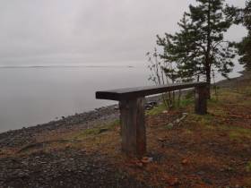 Stämpeln fanns på plats vid sydöstra entren och energinivån steg igen. Vår pilgrimspass börjar få riktigt många stämplar nu. Raktsträckan på Stockevägens asfalt bjuder på "orkanvindar" och det är först då vi kommer innanför gamla F4:s grindar som vinden lugnar ner sig. Vi fortsätter rakt genom det gamla militärområdet och leden viker av åt vänster på grusvägar med bommar för biltrafik. Grusvägen blet till liten stig innan vi går på strandremsan fram till Rödöbrons fäste.
