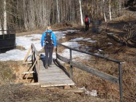 Efter någon km genar leden över en privattomt och vi tror att vi gått fel. Kvinnan som bor i huset kommer ut och påvisar att det är rätt och vi går vidare över en bäck och upp mot Sankt Olofsstigen. Vi passerar Båtsmans dansbana där det brukar vara marknad på sommaren.