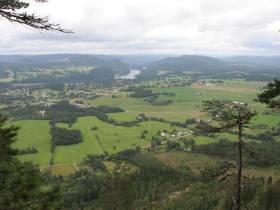 När leden viker av från grusvägen ner mot Gissjön går vi längs en stig som blir sämre och sämre för att till slut upphöra i ett hygge. Det är fortfarande ovisst om skyltningen var kass eller om vi verkligen skulle gått här. Om så är fallet finns lite att önska om ledens framkomlighet. Väl framme vid ett hus ser vi pilgrimsskyltningen igen och vi genar över privattomten och tar oss mot E14 på grusväg. Förvirringen i skyltningen som visar två olika håll gör att vi väljer E14 fram tills skyltningen dyker upp igen där leden svängen i höger bland småhus och snart vandrar vi på Rosvägen och korsar nästa väg och går vidare på en gångväg tills vi kommer fram till en tre vägs korsning. Ingen skyltning! Fränsta faller på liking-skalan och vi tar oss med hjälp av vår egen karta till Hembygdsgården där stämplen skall vara. Det saknas stämpel! Fränsta blir vårt bottennapp hittills. Ett stort tack till den kvinna som tog sig tid att visa oss vägen. Tack, du var det bästa med Fränsta.
