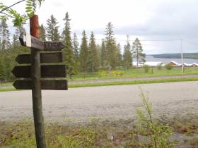 Väl framme bland Wångens byggnader är det svårt att se skyltningen. Men det gäller att gå uppåt tills du kommer fram till en rak travträningssträcka då dyker ledmarkeringarna upp igen. Med blicken långt fram och svepande över ängsmarkerna ser vi ledmarkering efter ledmarkering och när vi kommer in i skogen igen håller leden högsta klass.